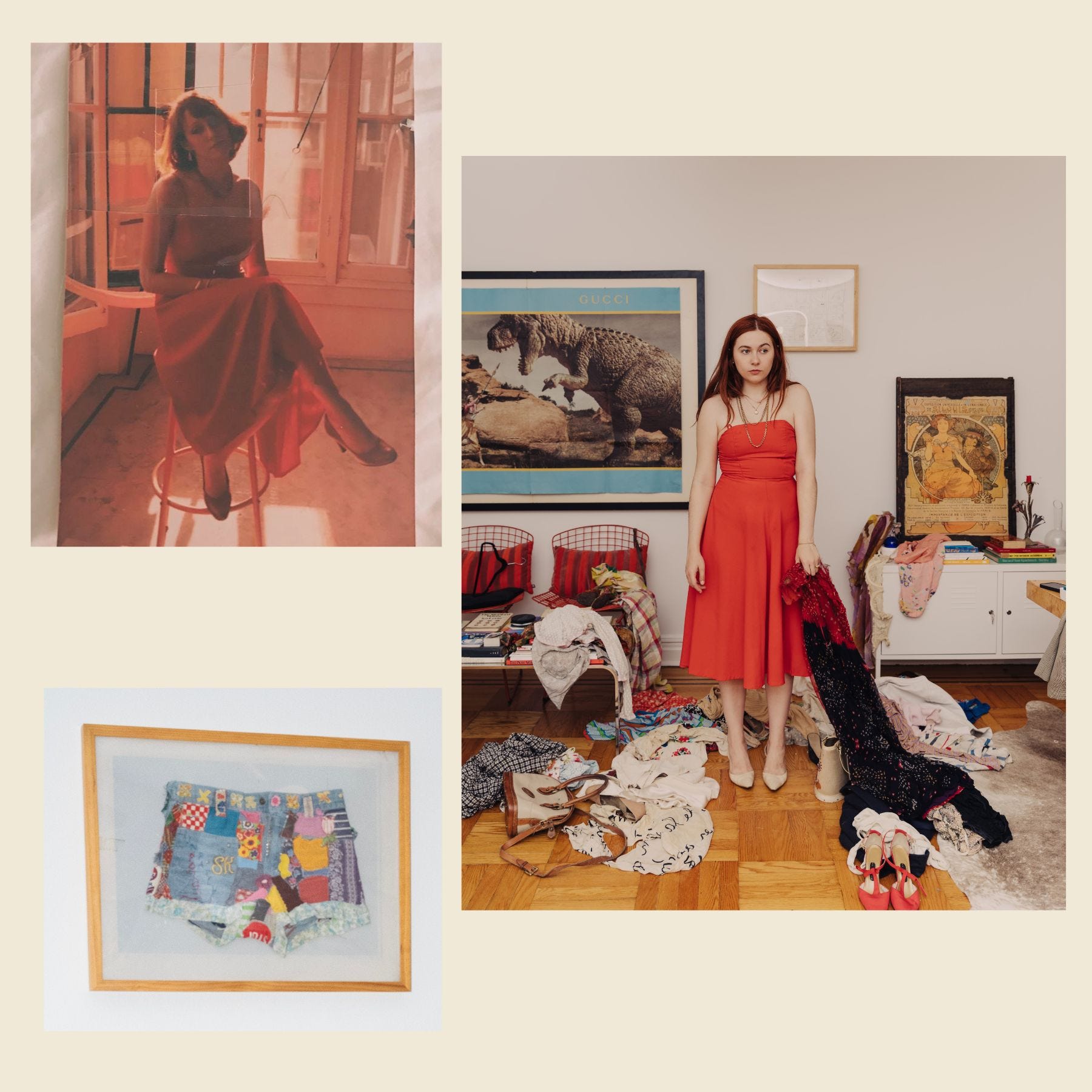 The things I keep are one of two categories—things with sentimental value and basics. I get the gift of cherishing things from my late mother—a woman some would call a hoarder, but I would call an archivist. There is a clear distinction in my mind—archiving things involves things that hold memory and experience and sometimes even sorrow. I wrote about how I drycleaned much of her wardrobe when she died for Vogue last year. While it feels nearly impossible to select a single item (given the sheer amount of clothing I own) I’ve selected something that I haven’t worn in almost two decades. When my mother was 12 she hand stitched patches onto a pair of shorts, a logo from a gas station, fabric from her brother’s Hawaiian shirts, Snoopy, a stop sign at the crotch. I grew out of them when I was 10. During a recent exercise of moving everything around my apartment, I framed them and hung them above my mirror. Even though I can’t wear them, they are emblematic of the pieces in my closet that are the most treasured to me, which are things that have my mother’s hand stitches in them. Like this red dress that she made from a pattern in the 80s that I wore for my friend Daniela’s visual piece called Inheritance.