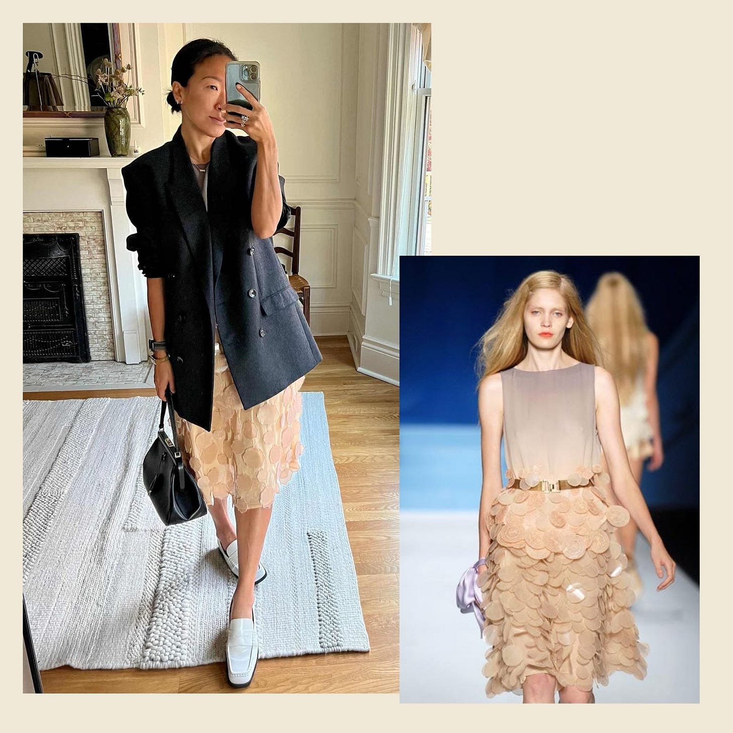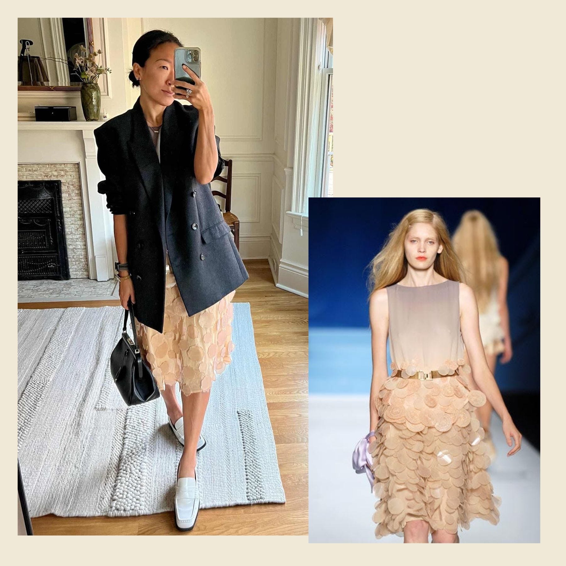 , In Mode VeritasWhen you asked me, I knew immediately which piece it would be! In 2009, I was shopping in Soho and walked into the now-closed Sportmax store at Prince & W. Broadway. I immediately fell in love with a silk ombre dress with large silk covered paillettes sewn onto the bottom half. It was from the brand's S/S 2008 collection and I felt like my best self in it! I loved the delicate sheer ombre, the clack of the paillettes, and its overall ethereal quality. I soon found out that sitting down in that dress without bending the paillettes was challenging! But, no matter: from 2009 to 2013-ish, I wore it to a dozen or so weddings and other events, including twice as a bridesmaid. I wore it exactly like it was styled on the runway with a gold chain belt cinching my waist. My lifestyle changed after I had kids in 2014, so the dress sat in a dustbag for the next eight years. In 2022, I pulled it out again and have worn it a couple of times since. Interestingly, wearing it belted doesn’t feel right anymore so now I wear it uncinched. I keep it because I still wear it, but also because buying the dress felt like a milestone moment. It was my first big purchase and in doing so, it felt like I entered a different stage of my life. I lent it to a friend and, sadly, her dry cleaners shrunk the silk sheathes so they’re not circular anymore. But, c’est la vie. I’m not too precious about my clothes, even my most special pieces.