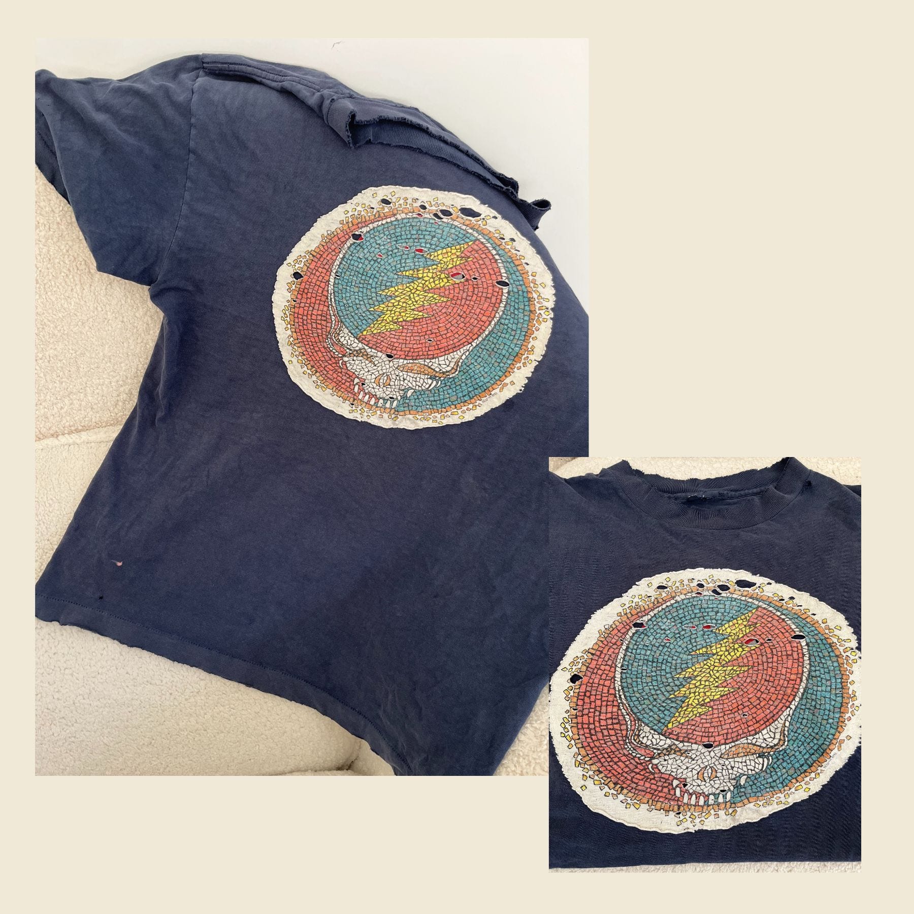 One of my most long standing wardrobe items is a vintage Grateful Dead T-shirt. In truth, it is my husband’s, but I have a what’s his is mine, what’s mine is mine mentality. It’s a cherished possession, not just because — much to people’s surprise — I like the Grateful Dead, but because he was wearing this t-shirt when I met him 22 years ago in Seoul, Korea. The t-shirt is holding on by a thread, but I feel like there is nothing worse than a fresh pristine band tee. The piece will always be sentimental to me, because it was the conversation starter that turned into us dating, getting married, and raising children together.